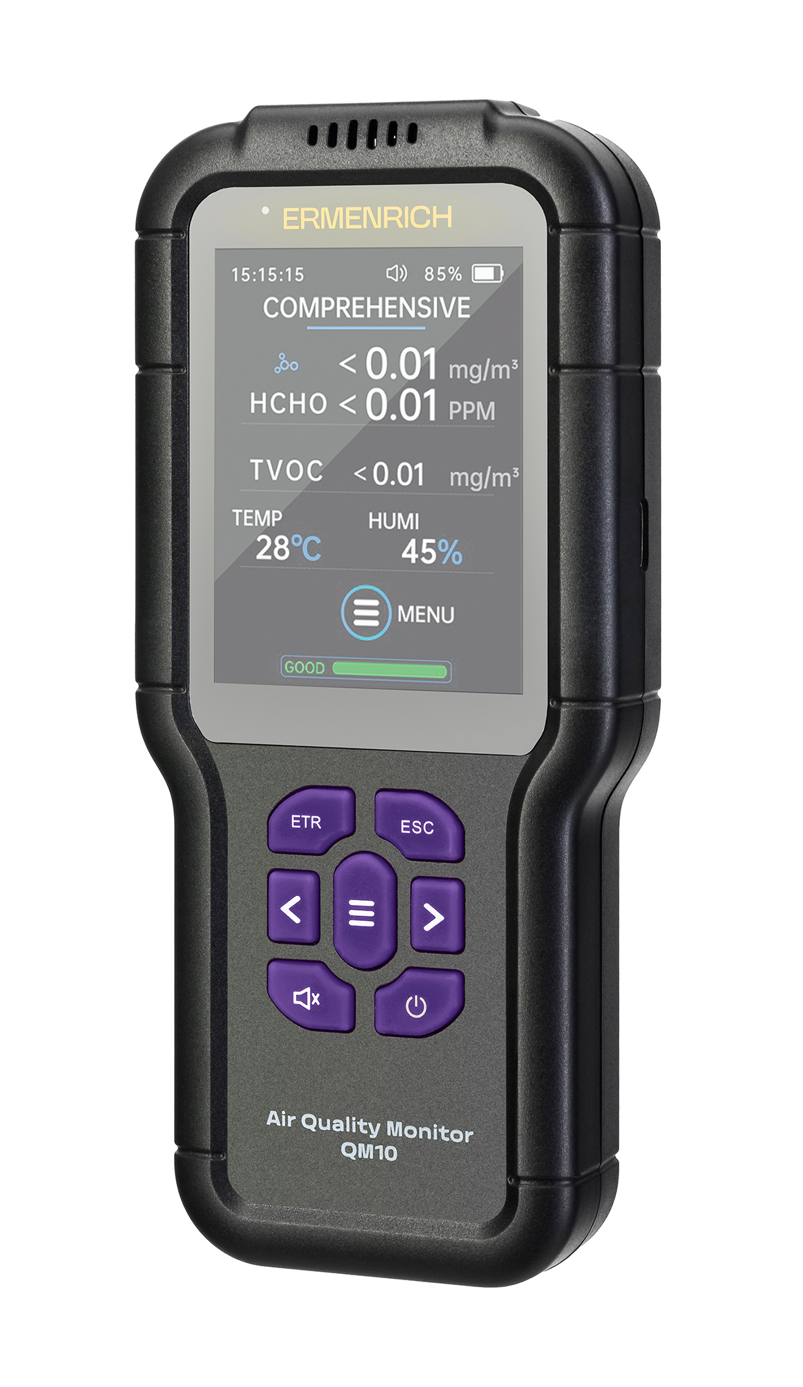 Das Ermenrich QM10 Luftqualitätsmessgerät ist ein Handgerät zur Analyse der Raumluftzusammensetzung, zur Ortung erhöhter Schadstoffkonzentrationen und zur Überwachung des Mikroklimas. Es kann in privaten und gewerblichen Umgebungen eingesetzt werden – in Büros, Hotels, Schulen und Kindergärten, Cafés, Geschäften usw., jedoch nicht für industrielle Zwecke – der Messbereich für TVOC (flüchtige organische Verbindungen) liegt bei 0,0–10,0 mg/m3, was nicht ausreicht, um die höheren Konzentrationen zu orten, die in industriellen Umgebungen häufig vorkommen.