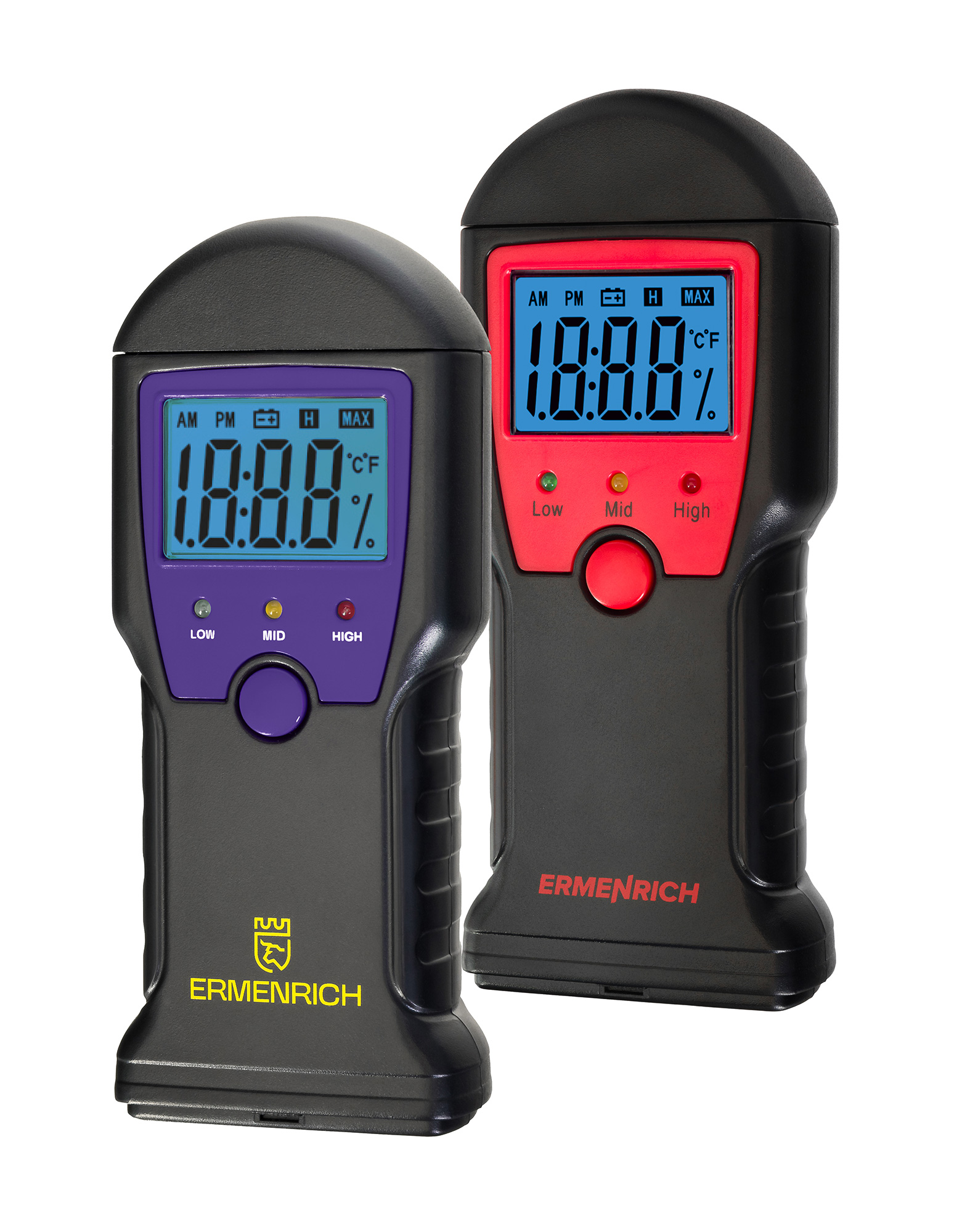 Der Ermenrich Wett MW10 ist ein stiftförmiger Feuchtigkeitsmesser zur Bestimmung des Feuchtigkeitsgehalts von Holz, Baumischungen und Mörtel. Das Gerät kann auch die Temperatur in Celsius oder Fahrenheit messen. Einfache Steuerung mit einer einzigen Taste. Die Messwerte werden auf dem integrierten Display mit großen Ziffern und einer hellen blauen Hintergrundbeleuchtung angezeigt. Unterhalb des Displays zeigen drei LED-Leuchten eine Gesamtbewertung des Feuchtigkeitsgehalts des Materials an: grün bedeutet niedrig, gelb bedeutet erhöht und rot bedeutet hoch.