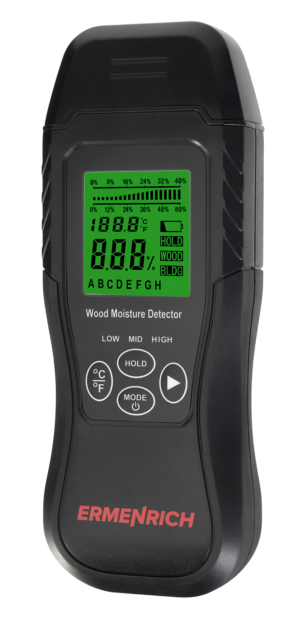 Der Ermenrich Wett MW30 ist ein stiftförmiger Feuchtigkeitssensor mit zwei Sensorstiften. Die Stifte sind unter der abnehmbaren Abdeckung verborgen. Das Gerät verfügt über ein integriertes Display mit grüner Hintergrundbeleuchtung, auf dem alle Daten zu Messungen und zur Bedienung angezeigt werden. Die LED-Leuchten zeigen den Feuchtigkeitsgehalt des Materials an: niedrig (grün), erhöht (gelb) und hoch (rot).