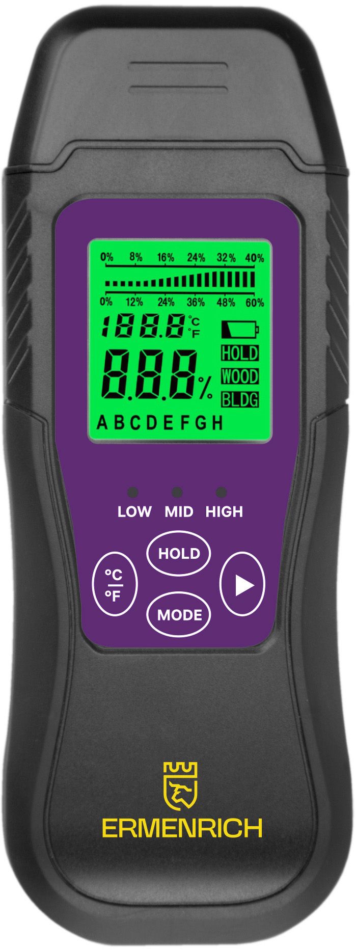 Der Ermenrich Wett MW30 ist ein stiftförmiger Feuchtigkeitssensor mit zwei Sensorstiften. Die Stifte sind unter der abnehmbaren Abdeckung verborgen. Das Gerät verfügt über ein integriertes Display mit grüner Hintergrundbeleuchtung, auf dem alle Daten zu Messungen und zur Bedienung angezeigt werden. Die LED-Leuchten zeigen den Feuchtigkeitsgehalt des Materials an: niedrig (grün), erhöht (gelb) und hoch (rot).